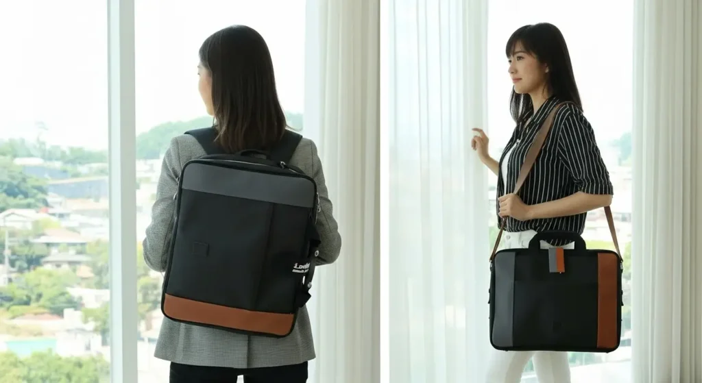 로디나트 백팩의 가장 큰 매력은 유연함에 있습니다. 백팩으로 메었을 때는 크리에이티브한 에너지를, 브리프케이스처럼 들었을 때는 전문적인 신뢰감을 줍니다. 특히 로디나트 워케이션 백팩이나 커스텀 백팩 시리즈는 미니멀한 실루엣 덕분에 포멀한 수트부터 캐주얼한 셋업까지 경계 없이 어우러집니다.